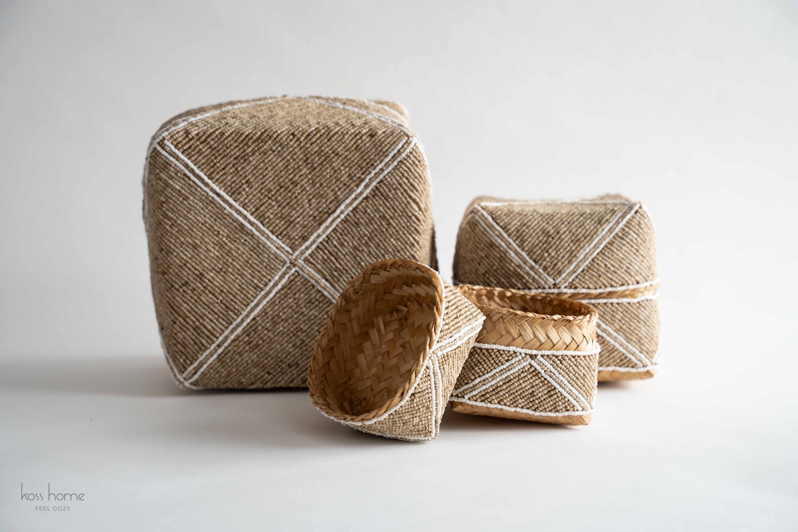 Ręcznie zdobione pudełka bambusowe, wykonane z naturalnego materiału i misternie naszywanych koralików w delikatnym piaskowym kolorze. Każdy zestaw składa się z trzech rozmiarów – 20, 15 i 11 cm, które idealnie sprawdzą się do przechowywania drobiazgów lub jako stylowa dekoracja wnętrza. Unikatowe rękodzieło zachwyca precyzją wykonania i naturalnym charakterem. Pudełka mają delikatny biały wzór.